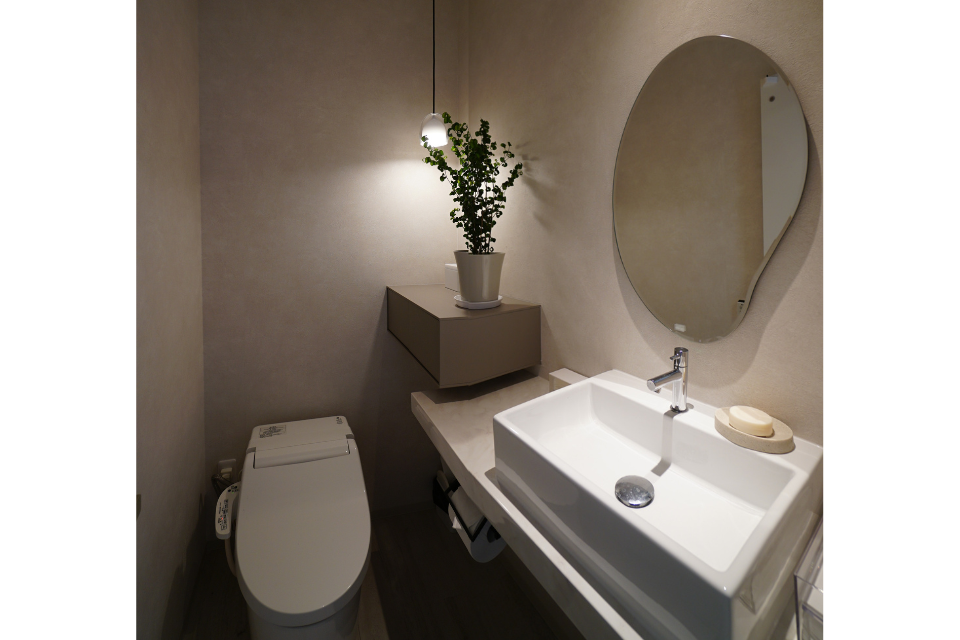白よりのグレーの床が部屋全体を明るく包み込み、床の段差に仕込んだ間接照明がアクセントに。